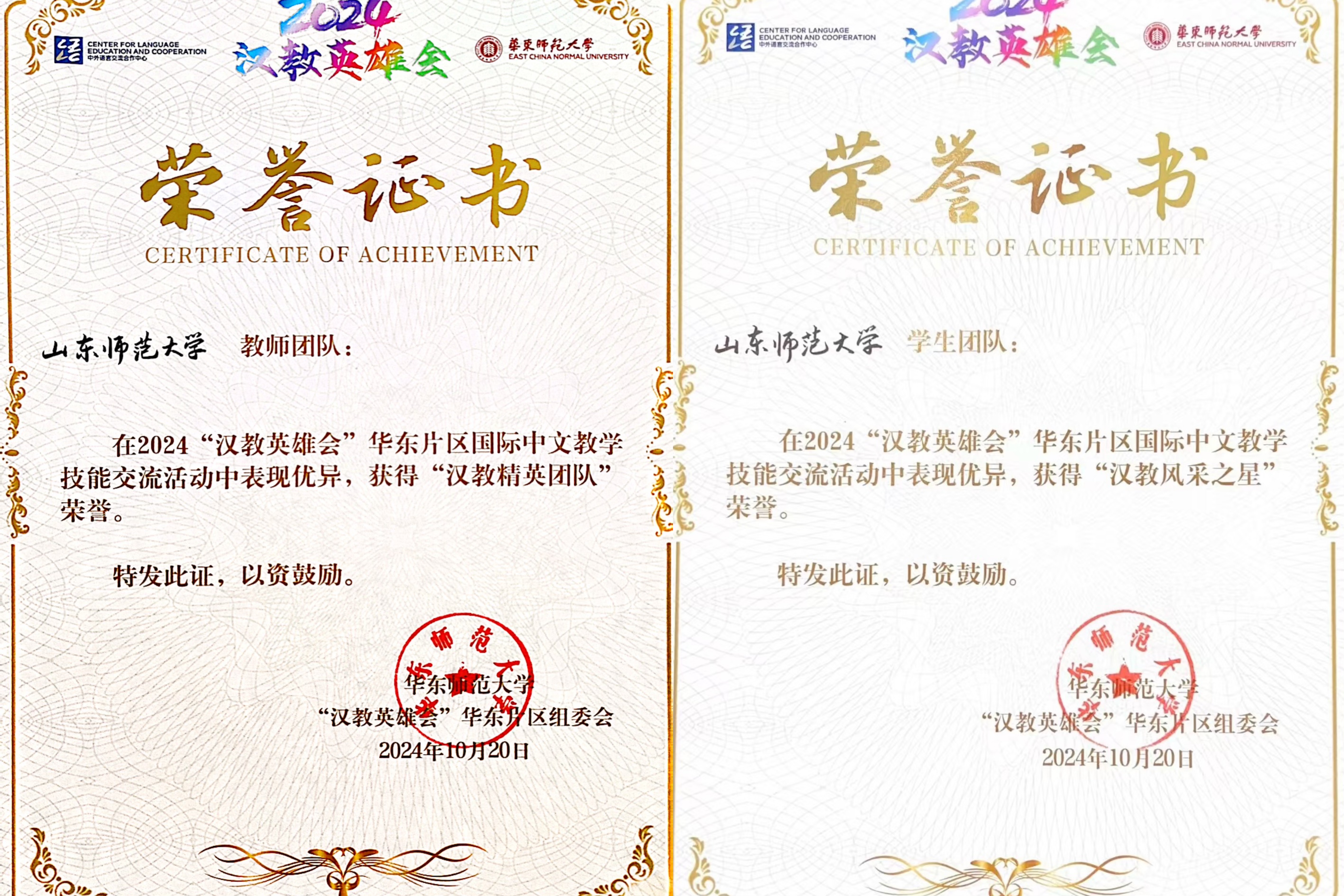 2024年10月19-20日,由教育部中外语言合作交流中心、全国汉语国际教育专业学位研究生教育指导委员会联合主办的2024年“汉教英雄会”华东片区国际中文教学技能线下交流活动在华东师范大学举办。我校国际教育学院和文学院师生联合组成教师队、学生队参加此次活动,其中教师队是我校首次参加该项活动并由文学院邹强副院长带领,学生队由国际教育学院盛蕾老师带领。经过激烈角逐,教师队从 7 组参赛高校中脱颖而出,获得“汉教精英团队” 称号;学生队从 20 组参赛高校中崭露头角,荣获“汉教风采之星” 称号。